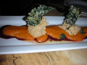 Crispy kale leaves are a case in point – shredded kale splattered with a tangy nut butter and then dehydrated until they really are crispy. I could eat them by the handful. Some of them turn up as jaunty little plumes on an appetizer of very thinly sliced raw red beet topped with a creamy purée of red pepper and a thicker “ricotta” of tangy puréed cashew. Big flavours, contrasting textures… The menu describes the dish as “ravioli” which is strange and misleading since the ingredients are layered not stuffed. And why call the nut purée “ricotta.” This food doesn’t need to borrow words from orthodox gastronomy to explain itself.