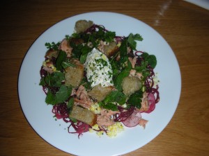 Even ordinary portions are generous at Parts and Labour and when dishes are heaped so high presentation ceases to be much of an issue. The “plate” I began with consisted of soft chunks of moist, lightly smoked trout mixed up with chopped hard-boiled egg, thinly sliced radishes, crunchy beetroot that had been shredded like vermicelli and tossed with a tart dressing (a little too tart for the delicate flavour of the trout) and torn bread warmed up with some oil to form delicious croutons. Fresh herbs were everywhere – coarsely torn mint, parsley, dill and chervil that brightened the dish considerably. That is their role in life, after all, to be their own fresh, unapologetic selves, like witty singletons a wise host asks to his dinner parties. In the middle of it all was a dollop of tangy horseradish crème fraîche the size of a child’s fist. It was a pretty good dish – enough food to satisfy as dinner if you were eating at home – with some interesting flavour combinations.