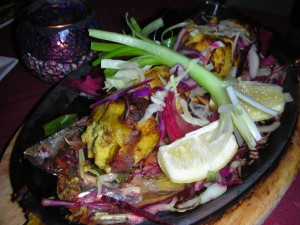 Lucknowi reshmi kebab. Brijesh Kumar is the tandoor chef at The Copper Chimney and as central to the experience as his colleague, Chef Rana. In visits to come, we will explore the rest of the tandoori menu. This time we had the Lucknow-style kebab, massive pieces of marvellously moist and tender chicken breast that had been marinated in yoghurt, saffron, pulverized onion and garlic and some delicate spices, threaded on a spit and cooked in the tandoor. It reached the table on a very hot metal platter, sizzling and smoking and surrounded by julienned onion, pickled onion, cabbage and other vegetables. Chef Kumar had timed it perfectly, the chicken cooked through but awesomely juicy, the marinade slightly browned in places.