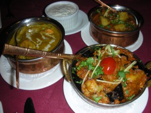 Lamb vindaloo. The ongoing tour of India takes us to Goa for an authentic version of the traditional macho tester. The lamb was lean and tasty but a tad dry and fibrous – the only textural flaw in the evening. The sauce was super, packed with vinegar and pepper and just enough heat to bring a prickle of perspiration to the pate of my head. (That’s my chili meter though it seems to vary with our species. I know some people break into a chili sweat on their foreheads or even under their eyes… Perhaps a kind reader will explain why people differ.) Big chunks of fried potato resting on top were a wicked garnish.