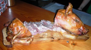 The invitation to compete had been sent out to some 20 chefs and McDonald accepted the first eight to reply. Michael Steh of Reds was there (he won last year) and so was Teo Paul of Union, Matt DeMille of Parts & Labour, Ryan Crawford of Stone Road Grille, Ryan Donovan of Marben, Ted Corrado of C5, Albert Ponzo from Le Select and Geoff O’Connor of Nota Bene. Each of them had prepared his best ground/cured/chopped/puréed/ emulsified/brined pork dish, all in pursuit of a handsome prize – a $400 gift certificate for the Cookbook Store, the opportunity to display the trophy for a year (it’s like something out of Lord of the Flies – a wooden board engraved with the name of the Magister Porcarius and decorated with four shins and trotters from a patanegra pig and a pig’s skull (you can see the kill hole above the left eye)) and the services of B.C. chef Mara Jernigan’s son Julian for a week. He’s starting out in the business and looking for work as a stagière.
