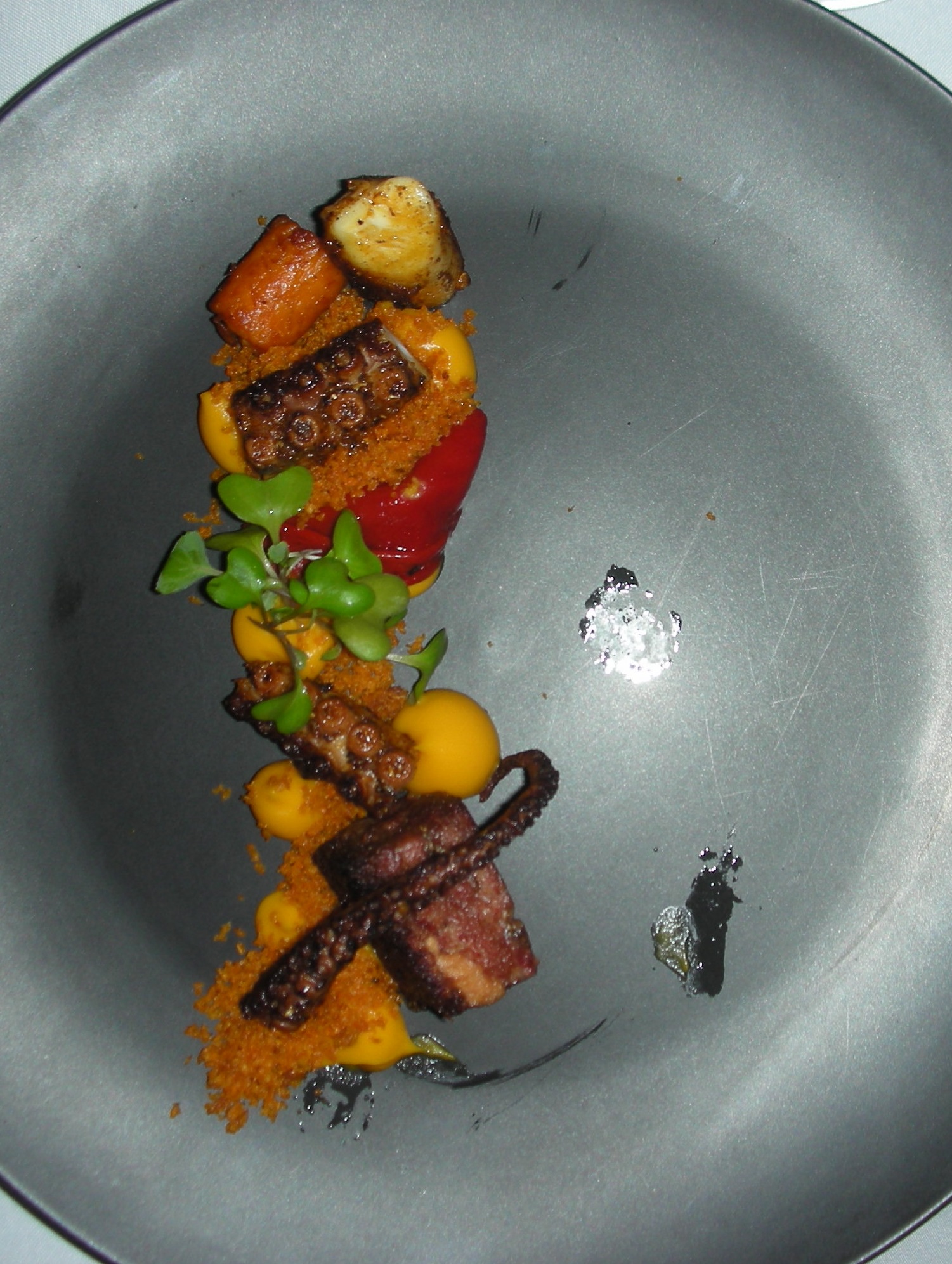 My second dish (“octopus – sweet potato – piquillo – pork”) was equally successful. The grilled octopus tentacle was tender and juicy at its plumpest diameter, tapering to crispness. A salty chunk of braised pig face, its surface nicely caramelized, turned out to be as unctuously soft as a terrine. A single slice of sweet piquillo pepper refreshed the protein, its simplicity subtly pointing up the dramatic transformations imposed on the sweet potato. Here it appeared as a purée, barely spiked with something that might have been mustard. There it was turned into powdery crumble. At the north and south of the beautiful presentation it showed up disguised as a piece of roasted carrot. Sure, it was all very clever, but also meaningful on the palate and a textural tour de force. The suggested wine, Viña Cartín 2012 Albariño, was a fine choice, with refreshing acidity but enough stone-fruit fragrance to harmonize with the piquillo and the sweet potato.